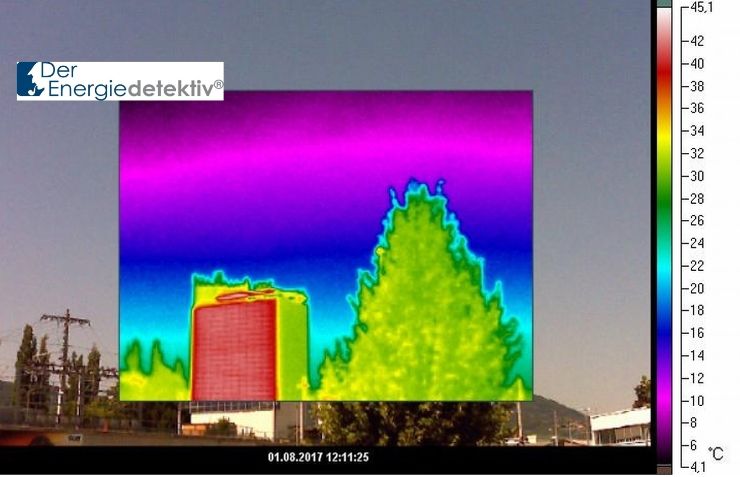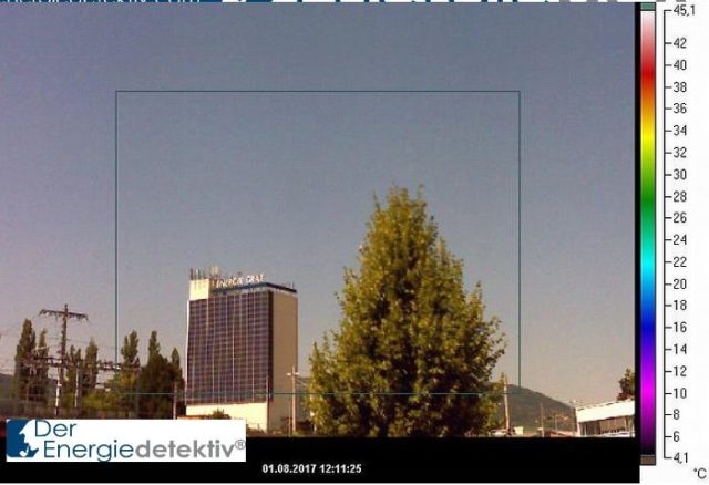 Großflächige PVA an einer Fassade in der Stadt Graz. Auch hier zeigt der Vergleich mit dem Baum den Unterschied in der Verarbeitung des eingestrahlten Lichtes. Die solare Stromproduktion ist verbunden mit einer hohen Wärmeabgabe – die PVA wird zum innerstädtischen Strahlungsheizkörper und zur Wärmebelastung der Umgebung