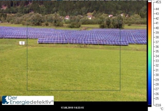 In über 900 Meter Seehöhe ersetzt auf ca. 15.000 m² eine andere PV-Anlage die bisherige Almwirtschaft. Der Blick durch den Sicherheitszaun offenbart im Juni eine Oberflächentemperatur um 50°C. Selbst die hier gezeigte Rückseite der Solaranlage liegt 25 Grad über der Lufttemperatur, was zur Erwärmung der Atmosphäre beiträgt.