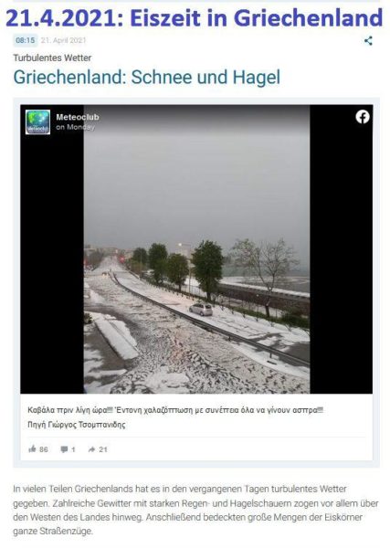 Ungewöhnliche April-Kälte auch in Griechenland um den 21.4.2021. „…In den Bergen im Norden des Landes meldete sich sogar der Winter zurück. In etwa 1200 Meter Höhe schneite es zum Teil kräftig. Besonders rund um Metsovo in der Region Epirus zeigte sich die Landschaft tief winterlich. Ursache für die Wetterkapriolen im östlichen Mittelmeerraum war kalte Polarluft in der Höhe. Diese flutete am vergangenen Wochenende große Teile Europas und breitete sich bis in den Süden Griechenlands und Italiens aus. Aufgrund großer Temperaturunterschiede zwischen dem Boden und etwa 5500 Meter Höhe entwickelten sich kräftige Schauer und Gewitter.“ Quelle: WO-Bericht Schnee und Hagel in Griechenland.