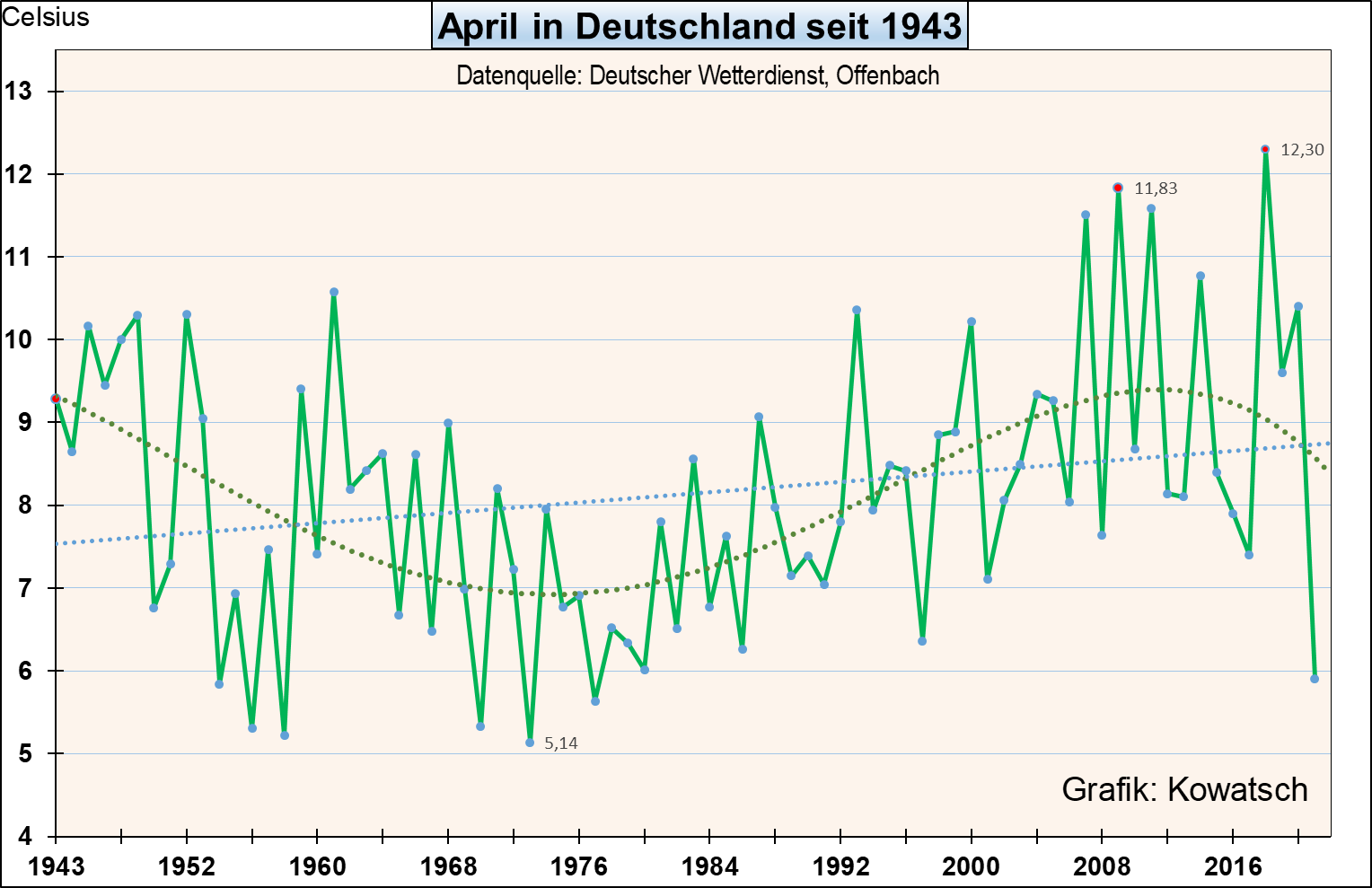 Abbildung 1: Seit 1943 zeigen die DWD-Messstationen für den April eine ausgesprochene Depression um 1961 bis 1990. Erst ab 1993 wurde der April wieder wärmer bis zu seinem Rekordwert im Jahre 2018. Seit 1943 war der April 2021 unter den zehn kältesten und seit 1881 laut DWD der 19.-kälteste. Er war nach 1929 zum Leidwesen der Autofahrer (morgendliches Scheibenkratzen) und der Gartenbesitzer der zweitfrostreichste April