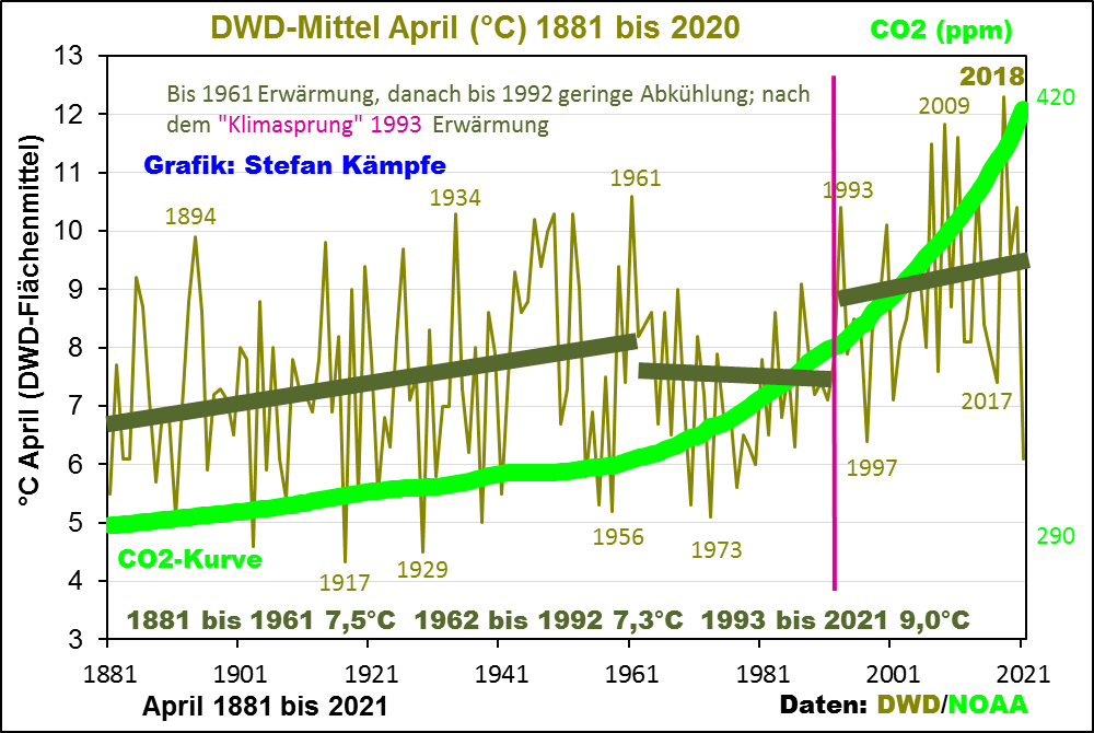 Abbildung 2: Nach einer im Vergleich zu den meisten anderen Monaten ungewöhnlich langen Erwärmungsphase, die bis 1961 dauerte, fehlten für gut 30 Jahre sehr milde Aprilmonate (solche deutlich über 9°C); erst ab 1993 traten sie plötzlich ungewöhnlich oft auf und gipfelten im Rekord-April von 2018. Aber auch während der Abkühlungsphase um 1970 stieg die CO2-Konzentration schon deutlich an – CO2 kann das Temperaturverhalten des Aprils also nicht erklären.