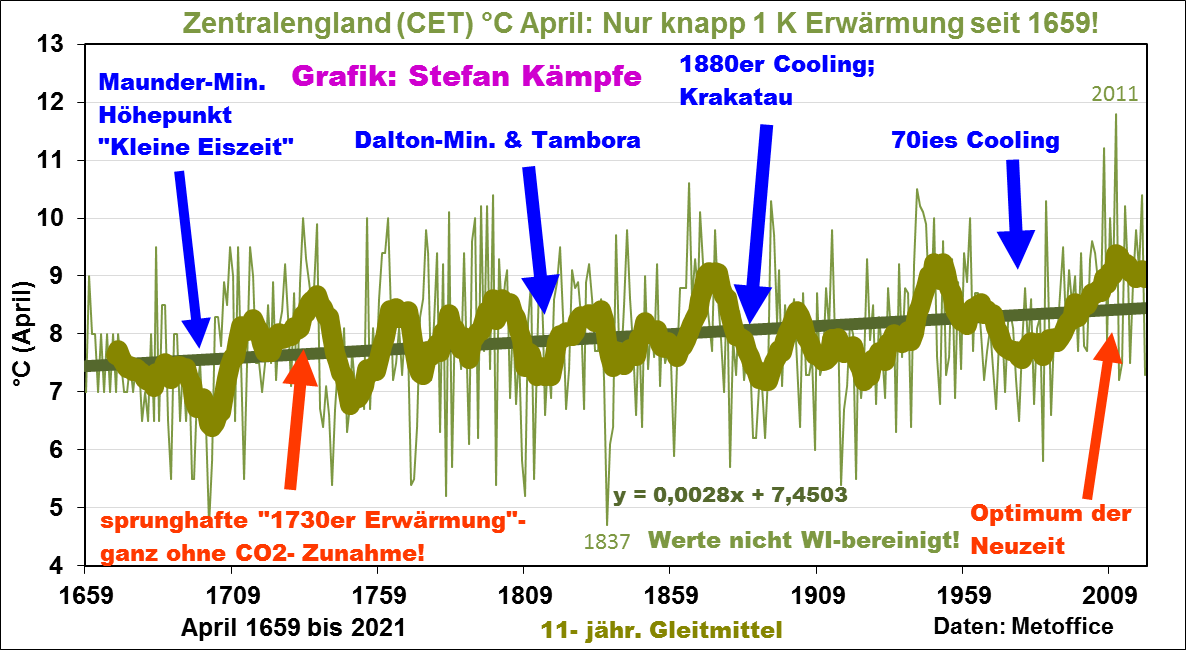 Abbildung 3: Im Neuzeit-Optimum (um 2010) gibt es mit 2007 und 2011 nur zwei herausragend warme Aprilmonate in England, ansonsten unterscheidet sich diese nicht von früheren Warmphasen. Auch hier erkennt man die Kaltphase der 1960er bis 1980er Jahre; der letzte Temperatursprung nach oben begann aber schon 1987. Man achte auf die Kaltphase um 1880 – genau in dieser beginnt die DWD-Messreihe. Die Langfrist-Erwärmung beträgt seit 1659, also über mehr als 360 Jahre, nur knapp 1 Kelvin – das ist alles andere als beunruhigend und, außer der natürlichen Erholung des Klimas seit der „Kleinen Eiszeit“, zumindest teilweise auch WI-bedingt. Das mögliche Ende der aktuellen Warmphase deutet sich an.