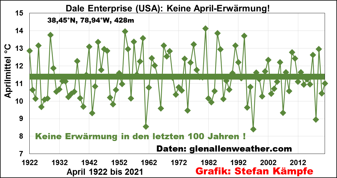 Abbildung 4: Bei dieser ländlichen Station in den USA hatte der April vor 27 Jahren einen Temperatursprung nach unten; das kältere Niveau hält bis heute an. Seit stattlichen einhundert Jahren fehlt dort jegliche April-Erwärmung.