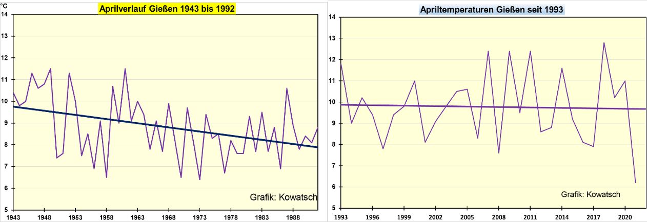 Der DWD errechnet für diesen April ein vorläufiges Temperaturmittel um die 6°C, das wären fast 3 Grad unter der neuen Vergleichsperiode 1991-2020, und immer noch etwa 1,3 Grad unter der alten Vergleichsperiode 1961-1990, die verhältnismäßig kalt war, was unsere erste Grafik zeigt..