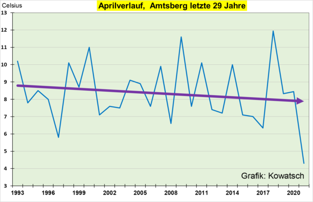 Abbildung 7: Die WI-arme Wetterstation in Amtsberg zeigt nach dem Temperatursprung 1993 bis heute sogar eine leichte Abkühlung. Erklärbar ist die fallende Trendlinie mit dem extrem kalten April 2021 im Erzgebirge. Der letzte Wert zieht die Trendlinie nach unten. Die Station steht seit 1981 unverändert an diesem Standort und es war mit Abstand der kälteste April, nicht nur seit 1993, sondern seit Messbeginn vor über 40 Jahren