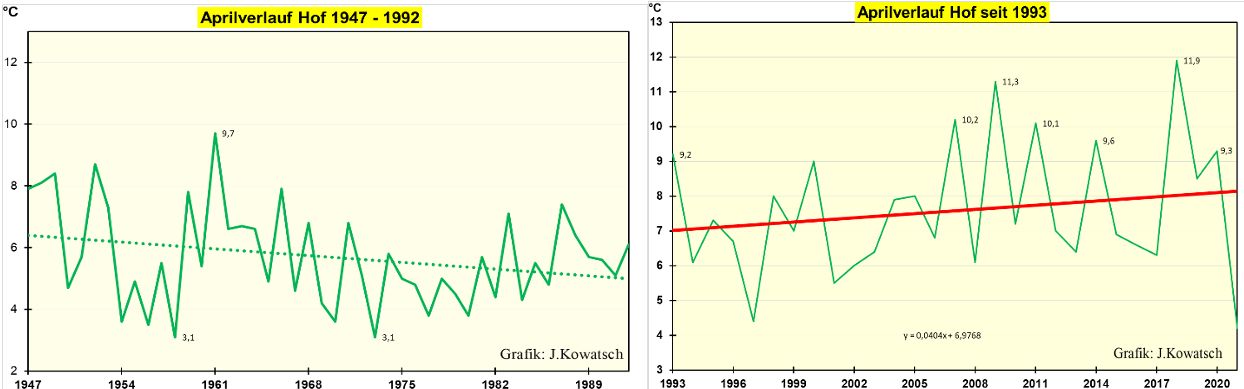 Diese Richtlinien sind sehr allgemein und können nicht jede mögliche Situation abdecken. Nehmen Sie deshalb bitte nicht an, dass das EIKE Management mit Ihnen übereinstimmt oder sonst Ihre Anmerkungen gutheißt. Wir behalten uns jederzeit das Recht vor, Anmerkungen zu filtern oder zu löschen oder zu bestreiten und dies ganz allein nach unserem Gutdünken. Wenn Sie finden, dass Ihre Anmerkung unpassend gefiltert wurde, schicken Sie uns bitte eine Mail über "Über Uns->Kontakt"Noch ein Nachtrag zu den Apriltemperaturen: Diese stammen vom DWD und wurden in den letzten 7 Jahren nicht verändert. Bei den Februar- und Märzreihen haben wir in den Artikeln immer dazugefügt, dass die Monatstemperaturen der ersten Hälfte der Betrachtungsreihe ab 1881 vom DWD nach unten, also kälter gemacht wurden. Man könnte auch sagen, die Trendlinie seit 1881 wurde beim Februar/März nachträglich steigender gemacht, beim Monat April nicht. Dafür ist die Wirkung des Wärmeinseleffektes auf die Temperaturen beim Monat April fast am höchsten, neben der bereits starken Sonnenstrahlung wirkt beim April auch noch die nächtliche Heizung in den Wärmeinseln, siehe den Grafikvergleich von Hof und Amtsberg ab dem Jahre 1993. (Abb.7 und 8b)