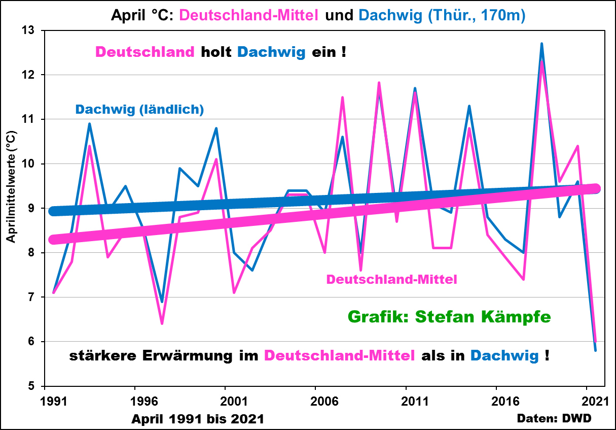 Abbildung 9: Seit 1991 nur unwesentliche April-Erwärmung an der sehr ländlichen Station Dachwig nordwestlich von Erfurt. Das DWD-Mittel (rosa) hat das ursprünglich wärmere Dachwig in diesen 31 Jahren praktisch eingeholt. Bitte beachten: Ab 1993 wäre die Trendlinie von Dachwig ebenfalls eine hozizontale wie andere WI-arme Stationen, während die DWD-Trendlinie steigend bleibt.