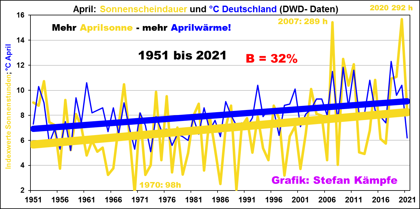 Die langfristige April-Erwärmung in West- und Mitteleuropa wurde von der natürlichen Erholung aus der Kleinen Eiszeit heraus, verursacht; Wärmeinsel-Effekte verstärkten diese Erwärmung. Die steigende CO2-Konzentration der Atmosphäre vermag die immer wieder auftretenden Temperatursprünge nicht zu erklären; besser gelingt das mit AMO, Besonnung und Wetterlagenhäufigkeiten. Gerade in den letzten dreißig Jahren konnten wir Dank einer AMO-Warmphase und einer Häufung südlicher Wetterlagen viele warme Aprilmonate genießen. Eine stark wachsende Besonnung, gefördert auch durch die Luftreinhaltemaßnahmen, unterstützte diese Erwärmung; sie verhinderte auch 2021 einen noch kälteren April. Aber sollten künftig, so wie 2021, die Nordlagen wieder die Oberhand gewinnen, so dürfte sich der zweite Frühlingsmonat wieder deutlich abkühlen; zumal mit einem früheren oder späteren Ende der AMO-Warmphase zu rechnen ist. In diesem Sinne war der raue April 2021 ein Warnschuss – wir sollten und keinesfalls zu sicher sein; dass uns die bisherige seit 1993 wohltuende April-Erwärmung erhalten bleibt.