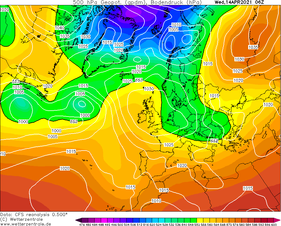 Abbildung 11: Hoher Luftdruck ganz in unserer Nähe über Großbritannien – aber das bedeutet keinesfalls ein lupenreines Schönwetter, sondern bei der nördlichen Anströmung kalte Luft und besonders tagsüber auch Wolkenfelder. Wetterkarte vom 14. April 2021, Bildquelle: wetterzentrale.de