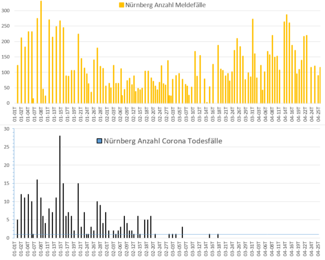 Bild 4 Stadt Nürnberg, Corona-Daten vom 01.01.2021 – 26.04.2021. Grafiken vom Autor erstellt. Quelle: RKI-Datensatz