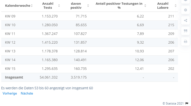 Und da ist der Autor überzeugt: Es werden die statistisch abgeschätzten, irgendwo zwischen 4 … 12 % neu Positiven in der Grundgesamtheit Deutschland sein und die anderen beiden Angaben sind grottenfalsch, aber regelmäßig publiziert und vor allem maßnahmenrelevant.