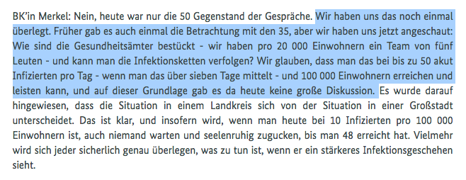 [Link] Correctiv schreibt dazu: … Überschreiten die neuen Fälle pro 100.000 Einwohner bestimmte Grenzwerte, ist das mit strengeren Corona-Schutzmaßnahmen verknüpft, wie genau das geregelt ist, kann in jedem Bundesland unterschiedlich sein. Den Grund hatte Bundeskanzlerin Angela Merkel am 6. Mai 2020 in einer Pressekonferenz erklärt: Man arbeite mit dem Schwellenwert von 50 neuen Fällen pro 100.000 Einwohnern, weil man glaube, bei dieser Menge die Infektionsketten noch nachverfolgen zu können.