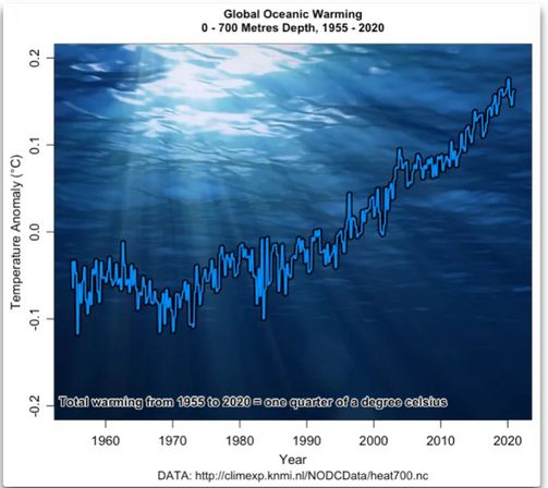 Abbildung 3. Veränderung der globalen Ozeantemperatur, Oberfläche bis 700 Meter Tiefe von 1955 bis 2020