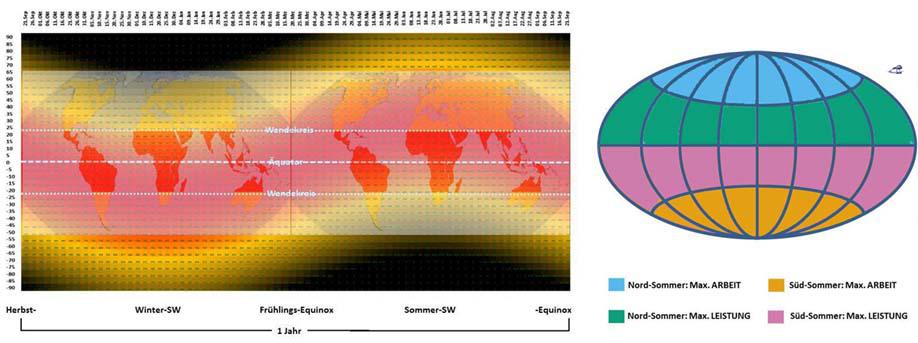 Abbildung 2: Zum physikalischen Unterschied zwischen Leistung (Watt) und Arbeit (Joule) der solaren Einstrahlung (Graphiken nicht flächengetreu)- Links: Tentative Gegenüberstellung der Beleuchtungsklimazonen mit dem Jahresverlauf der maximalen solaren Strahlungsleistung im Sommerhalbjahr (Südsommer linke Hälfte und Nordsommer rechte Hälfte). Overlays: Die Beleuchtungsklimazonen der Erde, von oben/unten zur Mitte: Polarzonen, Mittelbreiten, Tropenzone (Quelle: Wikipedia, Autor: Fährtenleser, Lizenz: GNU Free Documentation License) Darunter: Das örtliche Maximum der breitenabhängigen temperaturwirksamen spezifischen Strahlungsleistung der Sonne für die gesamte Erde über ein volles Jahr von Herbstäquinoktium zu Herbstäquinoktium- Rechts: Die maximale spezifische solare (Strahlungs-) LEISTUNG (~S-B-Temperaturäquivalent) und die maximale solare ARBEIT (Arbeit=Leistung x Zeit über die örtliche Tageslänge) im jeweiligen Sommerhalbjahr auf der Nord- und Südhalbkugel (weitere Erläuterungen sind hier zu finden)