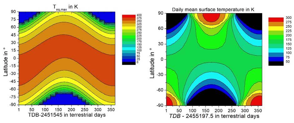 Die „Tägliche[n] Mittelwerte nach Kramm et al. (2017)“ in der rechten Abbildung, abgeleitet aus einer 24h-durchschnittlichen solaren ARBEIT [J/m²s] ohne Albedo, stellen dagegen die äquatoriale Zone bei 150-200 Kelvin mit gefrorenen tropischen Meeren als „Snowball-Earth“ dauerhaft im ewigen Eis dar; dafür verwandelt sich die Polarregion der jeweiligen Sommerhemisphäre in einen Touristen- und Temperatur-Hotspot mit 275-300 Kelvin.