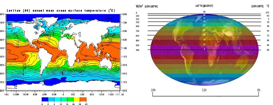 Abbildung 3: Temperaturvergleich Ozeane und S-B-Temperaturäquivalent der solaren Einstrahlung. Links: “Annual Mean Ocean Surface Temperature” based on observed data up until 1994 (NASA). Rechts: Das maximale breitenabhängige S-B-Temperaturäquivalent über den 24h-Tag im Äquinoktium, das aufgrund von Verdunstung und Konvektion nirgendwo erreicht wird