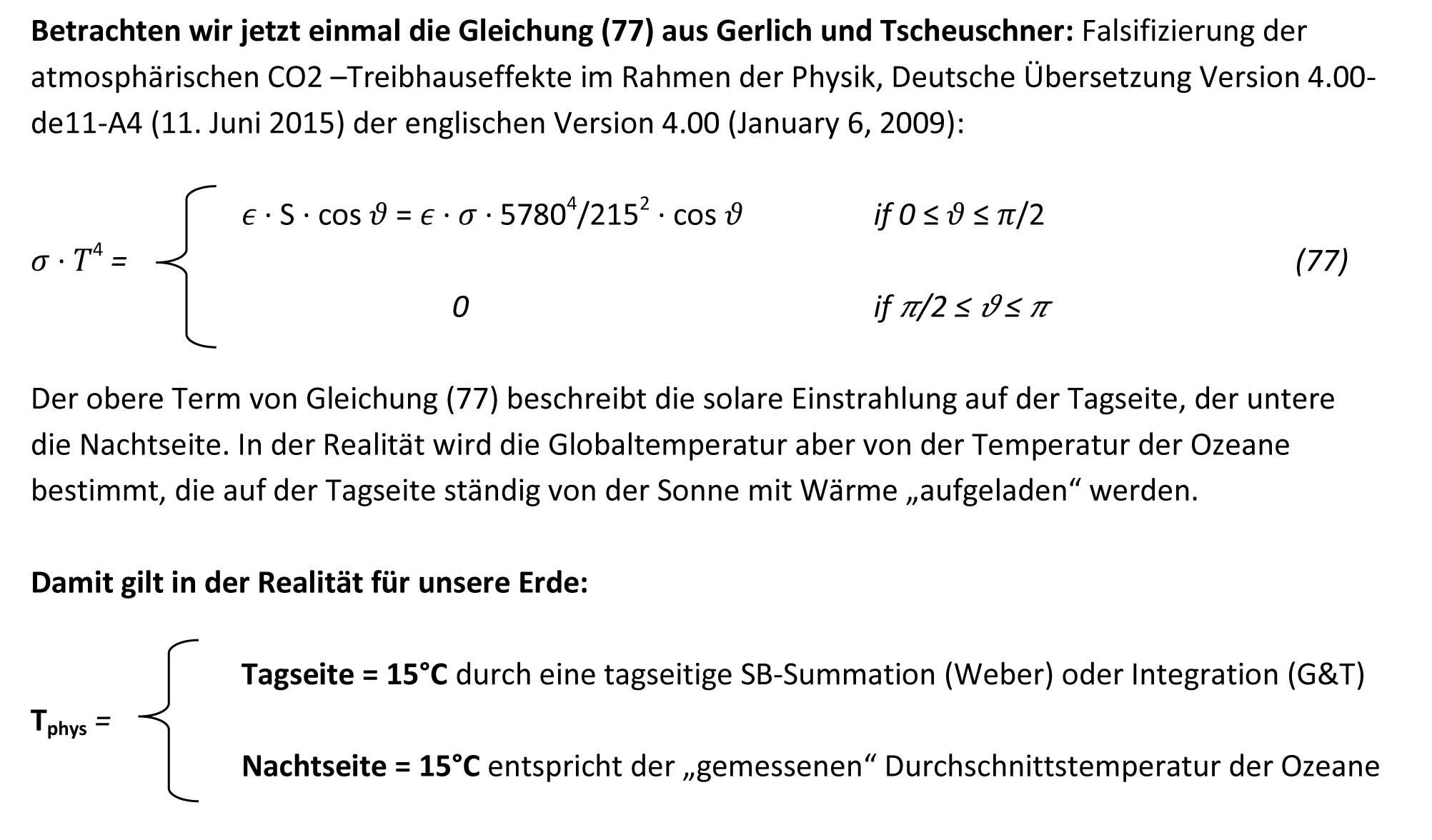 Zur Erinnerung, ich hatte in meinen beiden DGG-Veröffentlichungen (2016 und 2019) diesen sogenannten „natürlichen atmosphärischen Treibhauseffekt“ als Ergebnis einer fehlerhaften Faktor4-Inversion des Stefan-Boltzmann-Gesetzes widerlegt. Unter anderem hatte ich das hier noch einmal näher ausgeführt und einen konkreten Nachweis geliefert, dass unbeleuchtete Flächen in einer Inversion des Stefan-Boltzmann-Gesetzes nichts zu suchen haben, Zitat:
