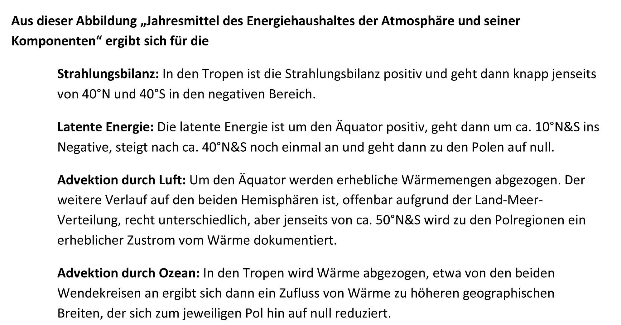 Alle diese Energieströme summieren sich für eine feste geographische Breite im durchschnittlichen Jahresmittel gerade auf null. Wir können hier also erkennen, dass sich die Überschüsse und Defizite gegenüber dem hemisphärisch berechneten S-B-Temperaturäquivalent durch den lateralen Transport von Wärme gerade global ausgleichen und damit mein hemisphärisches S-B-Modell voll bestätigen.