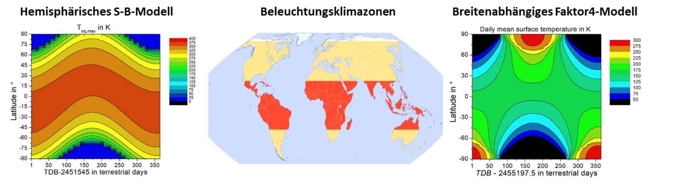 Wenn wir jetzt abschließend in der nachfolgenden Abbildung noch einmal die beiden Modell-Temperaturverläufe mit den Beleuchtungsklimazonen unserer Erde vergleichen, dann finden wir estätigt, dass unser Schulwissen über diese Klimazonen gar nicht mal so schlecht ist: