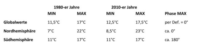 Im Ergebnis schwankt die Globaltemperatur also zwischen 12°C und 17°C, und im langjährigen Durchschnitt liegt sie bei etwa 14,5°C. Sie verläuft in Phase mit der Temperatur der Nordhemisphäre, und zwar mit dem Mittelwert der jeweiligen Temperaturen von Nord- und Südhemisphäre, beispielsweise als MED(MIN-Nord, MAX-Süd) oder MED(MAX-Nord, MIN-Süd).