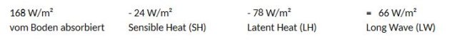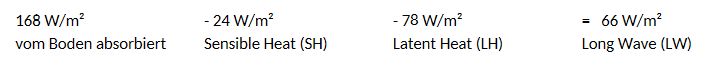 Abgegeben: 24 W/qm sensibel + 78 W/qm latent + 390 W/qm langwellige Strahlung = 492 W/qm