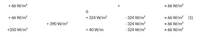 Diese 66 W/m² sind explizit in der Studie KT97 in TABLE 1 3 erfasst. In der Zeichnung FIG. 7 sind die 66 W/m² grafisch nicht dargestellt. Sie ergeben sich gleichzeitig aus der Subtraktion der Leistungen in W/m² in FIG. 7 „Absorbed by Surface – Back Radiation“ der rechten Bildhälfte oder 390W/m² – 324 W/m² oder: