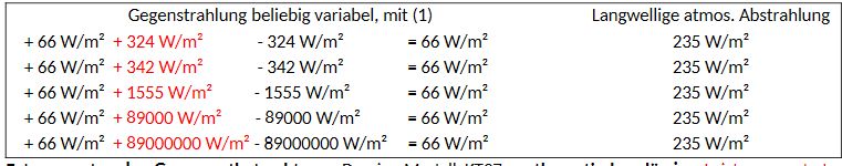 Damit entsteht der Gegenstrahlungs- „fluss“ immer aus Null, aus dem „Nichts“. Er ist für die energetische „Bilanzierung“ mathematisch „neutral“. Man kann den Rechenvorgang mit einer „Buchung“ assoziieren. Oder für (1) anders ausgedrückt, die Gegenstrahlung kann mathematisch jeden beliebigen Werten annehmen, beliebig variabel oder „fiat flux“.