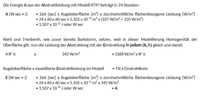 In der Modellhypothese KT97 verbleiben aus der gesamten, direkten Sonnenwirkung von 1367W/m2 (TSI) im rechnerischen Mittel lediglich 66 W/m² als wärmewirksamer, langwelliger Abstrahlungsanteil (LW) für die Erde übrig. Die Summe von erwärmender Sonnenwirkung als langwellige Abstrahlung von 66 W/m² (17%) und atmosphärische Gegenstrahlung 324 W/m² (83%) sollen so gemeinsam die durchschnittliche mittlere Globaltemperatur der Erde von ca. 15 °C mit 390 W/m² (100%) bei dieser Hypothese bilden, FIG.7. rechts. 83% entsprechen einer erwärmenden Wirkung von < 1% der im Molekülaufbau unsymmetrischen, atmosphärischen Gase (Wasserdampf, Kohlendioxid, Methan, Distickstoffoxid, Ozon,..). Die solare Einstrahlung von 1367 W/m² auf die Kreisfläche (r² π) projiziert, mit r = Erdradius, entspricht dem Durchschnittswert einer Abstrahlung von rund 342 W/m² (1367 W/m² / 4) auf der gesamten Erdkugeloberfläche (4 π r²).