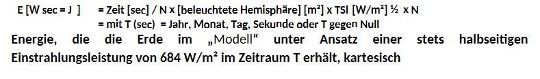 Die Energie E aus Durchschnittleistung in W/m² der modellierten Einstrahlung eines Jahres, Monats und eines 24 Stunden Erd-Tags wird bei Gleichsetzung der Abstrahlung mit der Einstrahlung die Energie weiterhin im Modell richtig errechnet, aber mathematisch wird die Einstrahlung über den „niedrigen“ Durchschnitt auf die dunkle Nachtseite mit einbezogen. Hierin liegt die Tücke dieser Modellvorstellung. In den nächsten Intervallstufen, Sekunde und in T gegen Null ist es in auf der Nacht-Hemisphäre der fiktiven, homogenen Modellkugel mathematisch taghell.