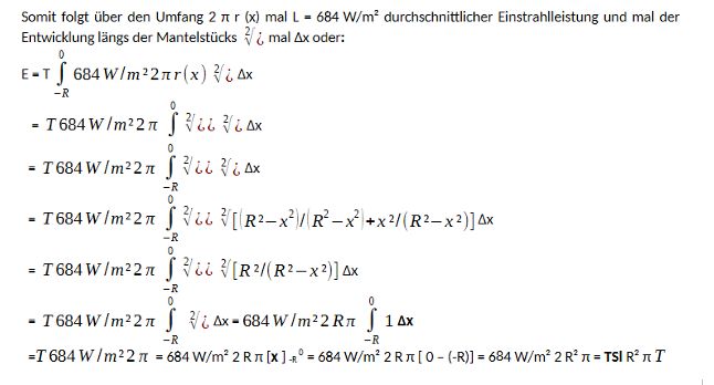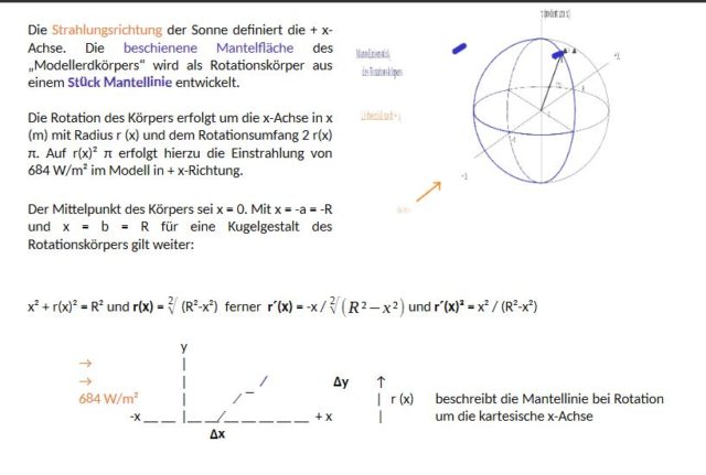 Die Integration über die Formulierung kartesischer Koordinaten zeigt die Parallelität der Einstrahlungsleistung L von 684 W/m² zur globalen x-Richtung und der stets nur halbseitig beleuchteten Mantelfläche der Kugel als Rotationskörper um die globale x-Richtung. Die Formulierung in Polarkoordinaten, die das identische Ergebnis liefern muss, zeigt dagegen das Wirken von 684 W/m² Einstrahlleistung auf eine stets doppelt gekrümmte Oberfläche, S.83 und S.176 -177. 9 Beide Rechenwege liefern das identische Ergebnis von 1.51 1022 J Energie aus Sonne unter stets halbseitiger Beleuchtung der in 24 h einmal rotierenden Erde liefern. Damit ist der Strahlungsverteilungsfaktor ¼ falsch und ½ richtig. Was es bedeuten kann, einen falschen Verteilungsfaktor in einer Netzmodellierung zu benutzen, siehe Kap. 5.17 9.