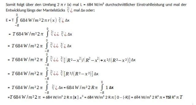 Energie E aus durchschnittlicher, flächenbezogener Leistung, die die Mantelfläche des Rotationskörpers in T(sec) erhält, mit x = 0 als Mittelpunkt. Die Energie in T errechnet sich über Integration entlang der x-Achse über Δx von x = -R bis x = 0, wenn in T stets nur eine halbe Kugel als Rotationskörper um x und Beleuchtung in x-Richtung erhält.