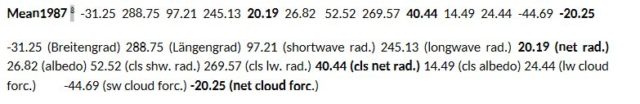 Net Cloud Forcing |-20.25 | + Net Radiation |20.19| = 40.44 = Clear-Sky Net Radiation (40.44). Es gibt eine Übereinstimmung. Wenn man die drei Net-Strahlungen berücksichtigt, erscheint es sinnvoll, sie als mathematische Beträge von Leistungen zu interpretieren.