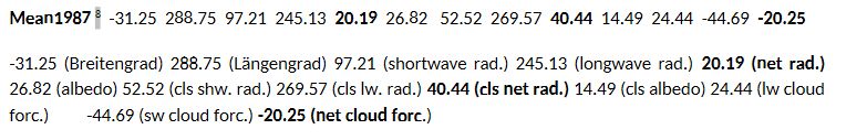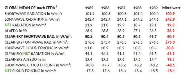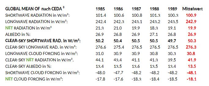 2) Genauere Betrachtung der Satellitenmesswerte: In der Rezeption von KT97 werden die Werte wattgenau benutzt. KT97 bezieht sich in S.199 auf die ERBE Datensätze „ …, we use the ERBE outgoing longwave flux of 235 W/m²…“ [Hervorhebungen hinzugefügt]. Es wird darauf hingewiesen, dass dieser olf für die einzelnen Satelliten ERBS, NOAA-9, NOAA-10 (ERBE) vorsichtig formuliert nicht 235 W/m² beträgt. Der Unterschied zwischen dem ERBE-Datensatz 1985-1989 z.B. (ERBS min. 242.3 – max. 243.5 W/m² nach CEDA) und der in KT97 modellierten Strahlungsgröße olf macht hier bereits 7 W/m² aus, weitere Abweichungen siehe auch Kap 4.1.1.bis 4.1.6 9. In KT97 wird auf S.206 erklärt: „The purpose of this paper is not so much to present definite values,…“. Die Qualität der Datensätze ist beim Satelliten ERBS am höchsten (Begründung: Kap. 2.3 bis 2.6 9). Mit diesen kann ein neues Modell formuliert werden (Kap 5 9). Bei den Datensätzen des ERBS Satelliten gibt es spezielle Net– Werte (siehe die weiter hinten im Text grün abgebildete Werte mit Verweis auf GLOBAL MEAN OF nach CEDA, Centre for Environmental Data Analysis, Oxford, England). Das folgende Beispiel eines Datensatzes der Quelle CEDA 7, gemeint ist die Zahlenkolonne nach Mean1987, verdeutlicht dies in a) bis c) als ein Beispiel zur Interpretation der Net– Strahlungen: