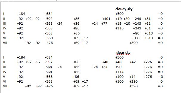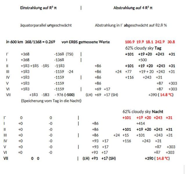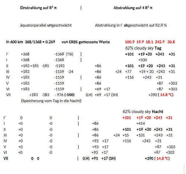 Die Atmosphärenebene I bis VII aus Tag + Nacht erfüllen in 24 h gemeinsam das horizontale Gleichgewicht der Leistungsbilanzierung. Die Einstrahlung stets in T gegen Null auf der halben Kugel und Abstrahlung auf der Vollkugel, durch | getrennt, erfüllen das vertikale Bilanzgleichgewicht. 368/1368 = 0.269 = Albedo von ERBS oder als Tag und Nachtmessung durch ERBS:
