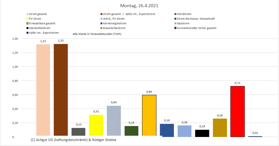 Montag, 26.4.2021: Anteil erneuerbare Energieträger an der Gesamtstromerzeugung 45,34 Prozent, davon Windstrom 9,76 Prozent, Solarstrom 23,88 Prozent, Strom Biomasse/Wasserkraft 11,7 Prozent. Die Agora-Chartmatrix: Hier klicken.