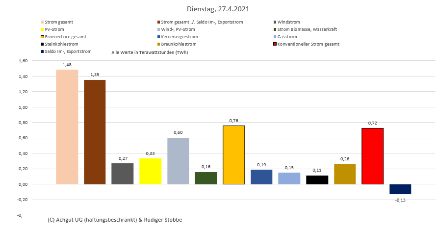 Dienstag, 27.4.2021: Anteil erneuerbare Energieträger an der Gesamtstromerzeugung 51,14 Prozent, davon Windstrom 18,12 Prozent, Solarstrom 22,44 Prozent, Strom Biomasse/Wasserkraft 10,58 Prozent. Die Agora-Chartmatrix: Hier klicken.