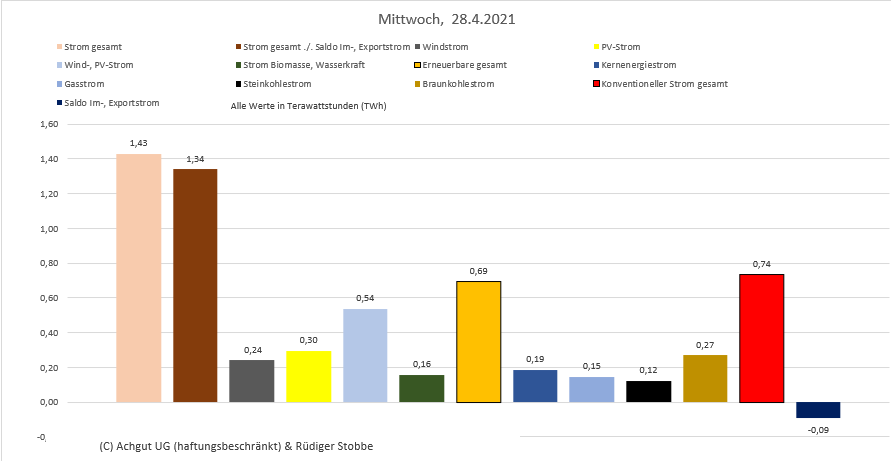 Mittwoch, 28.4.2021: Anteil erneuerbare Energieträger an der Gesamtstromerzeugung 48,53 Prozent, davon Windstrom 16,83 Prozent, Solarstrom 20,65 Prozent, Strom Biomasse/Wasserkraft 11,06 Prozent. Die Agora-Chartmatrix: Hier klicken.