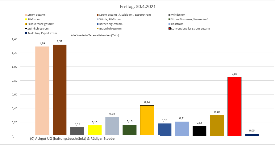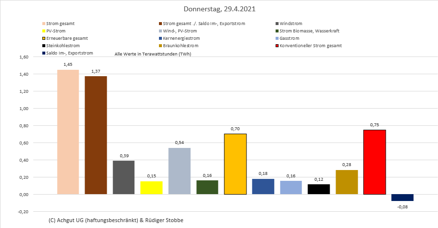 Donnerstag, 29.4.2021: Anteil erneuerbare Energieträger an der Gesamtstromerzeugung 48,29 Prozent, davon Windstrom 26,85 Prozent, Solarstrom 10,41 Prozent, Strom Biomasse/Wasserkraft 11,03 Prozent. Die Agora-Chartmatrix: Hier klicken.