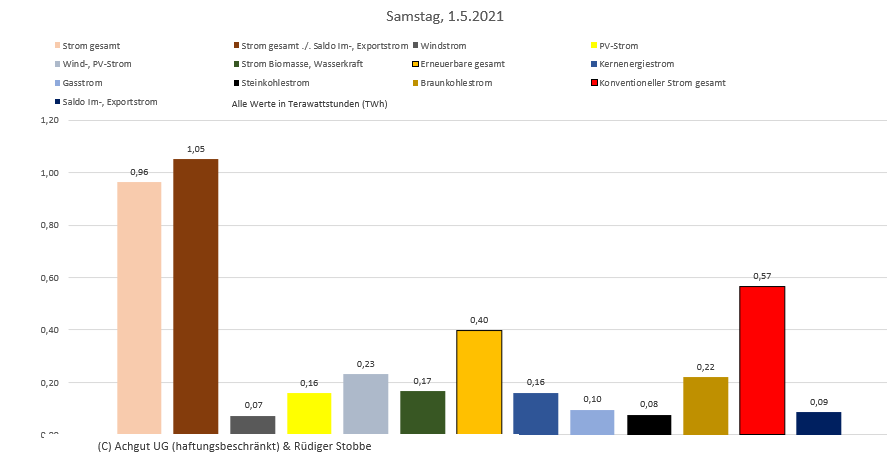 Samstag, 1.5.2021: Anteil Erneuerbare an der Gesamtstromerzeugung 41,28 Prozent, davon Windstrom 7,52 Prozent, Solarstrom 16,47 Prozent, Strom Biomasse/Wasserkraft 17,29 Prozent. Die Agora-Chartmatrix: Hier klicken.