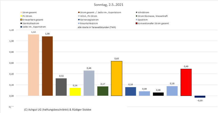 Sonntag, 2.5.2021: Anteil erneuerbare Energieträger an der Gesamtstromerzeugung 56,34 Prozent, davon Windstrom 28,33 Prozent, Solarstrom 12,83 Prozent, Strom Biomasse/Wasserkraft 15,19 Prozent. Die Agora-Chartmatrix: Hier klicken.
