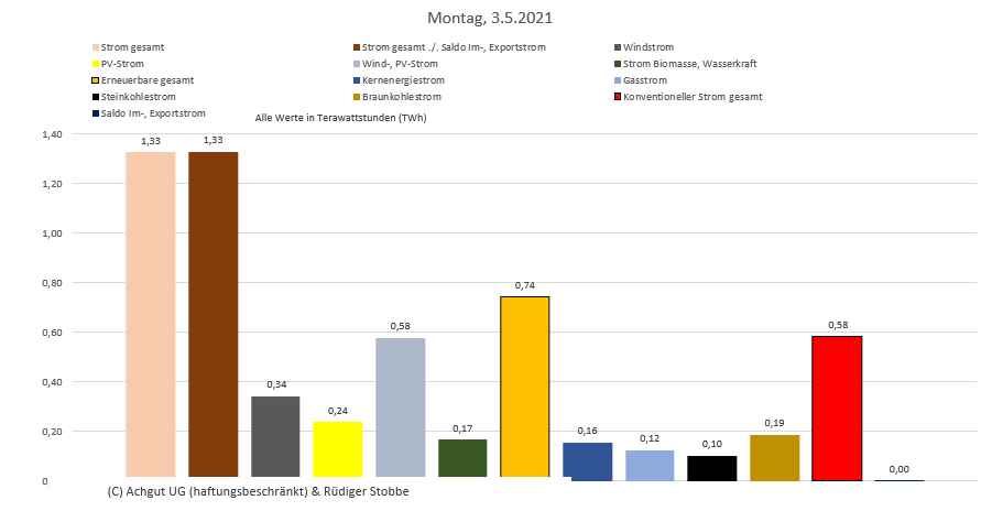 Montag, 3.5.2021: Anteil erneuerbare Energieträger an der Gesamtstromerzeugung 56,14 Prozent, davon Windstrom 27,7 Prozent, Solarstrom 17,9 Prozent, Strom Biomasse/Wasserkraft 12,54 Prozent. Stromdateninfo Tagesvergleich ab 2016. Die Agora-Chartmatrix: Hier klicken.