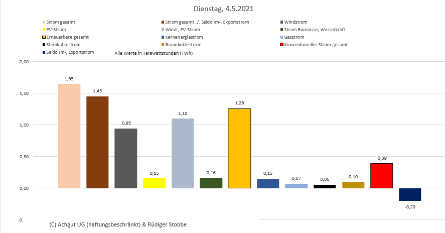 Dienstag, 4.5.2021: Anteil erneuerbare Energieträger an der Gesamtstromerzeugung 76,43 Prozent, davon Windstrom 57,35 Prozent, Solarstrom 9,29 Prozent, Strom Biomasse/Wasserkraft 9,80 Prozent. Stromdateninfo Tagesvergleich ab 2016. Die Agora-Chartmatrix: Hier klicken.