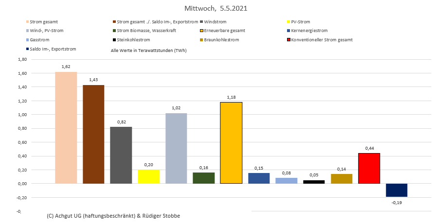 Mittwoch, 5.5.2021: Anteil erneuerbare Energieträger an der Gesamtstromerzeugung 72,96 Prozent, davon Windstrom 50,78 Prozent, Solarstrom12,27 Prozent, Strom Biomasse/Wasserkraft 9,91 Prozent. Stromdateninfo Tagesvergleich ab 2016. Die Agora-Chartmatrix: Hier klicken.