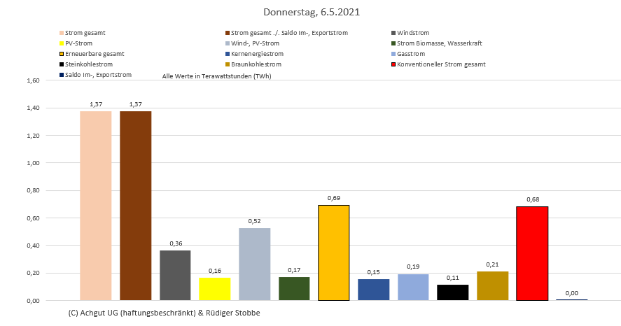 Donnerstag, 6.5.2021: Anteil erneuerbare Energieträger an der Gesamtstromerzeugung 50,47 Prozent, davon Windstrom 26,28 Prozent, Solarstrom 11,94 Prozent, Strom Biomasse/Wasserkraft 12,25 Prozent. Stromdateninfo Tagesvergleich ab 2016. Die Agora-Chartmatrix: Hier klicken.
