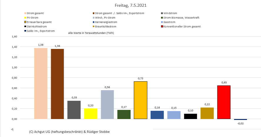 Freitag, 7.5.2021: Anteil erneuerbare Energieträger an der Gesamtstromerzeugung 52,94 Prozent, davon Windstrom 25,66 Prozent, Solarstrom 14,68 Prozent, Strom Biomasse/Wasserkraft 12,60 Prozent. Stromdateninfo Tagesvergleich ab 2016. Die Agora-Chartmatrix: Hier klicken.