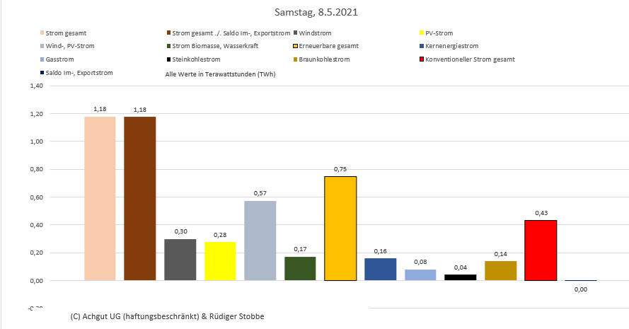 Samstag, 8.5.2021: Anteil Erneuerbare an der Gesamtstromerzeugung 63,31 Prozent, davon Windstrom 25,36 Prozent, Solarstrom 23,41 Prozent, Strom Biomasse/Wasserkraft 14,55 Prozent. Stromdateninfo Tagesvergleich ab 2016. Die Agora-Chartmatrix: Hier klicken.