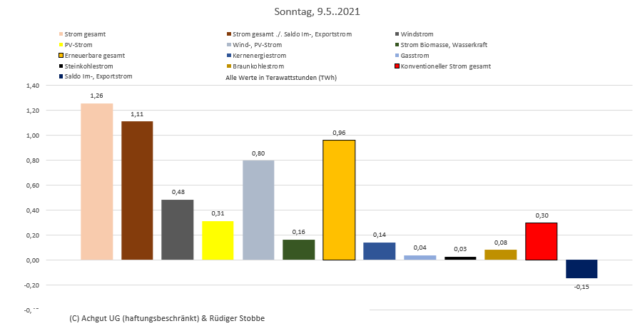Sonntag, 9.5.2021: Anteil erneuerbare Energieträger an der Gesamtstromerzeugung 76,37 Prozent, davon Windstrom 38,44 Prozent, Solarstrom 24,95 Prozent, Strom Biomasse/Wasserkraft 12,97 Prozent. Stromdateninfo Tagesvergleich ab 2016. Die Agora-Chartmatrix: Hier klicken.