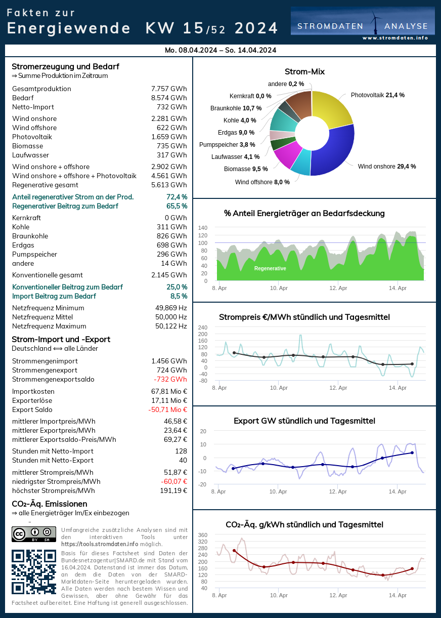 Daten, Charts, Tabellen & Prognosen zum 8.4.2024: Chart, Produktion, Handelstag, Import/Export/Preise/CO2 inkl. Importabhängigkeiten.