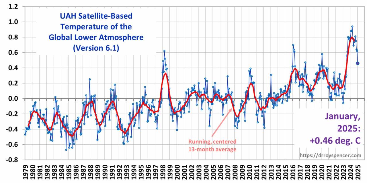 Wie die obenstehende Grafik zeigt, sind die globalen Mitteltemperaturen im Januar 2025 deutlich gefallen. Die Abweichung vom langjährigen Mittel der Satellittenmessungen beträgt nur noch 0,46 Grad Celsius. Über den (nicht durch CO2 verursachten) Erwärmungsschub in 2023/24 habe ich in meinem Oktober-Newsletter berichtet. Sie erinnern sich, die wesentlichen Ursachen waren die Verringerung der Wolkenbildung, der Vulkanausbruchs Hunga Tonga und die Reduktion des Schwefelgehalts im Schiffsdiesel – alles Faktoren die mit CO2 wenig zu tun haben.