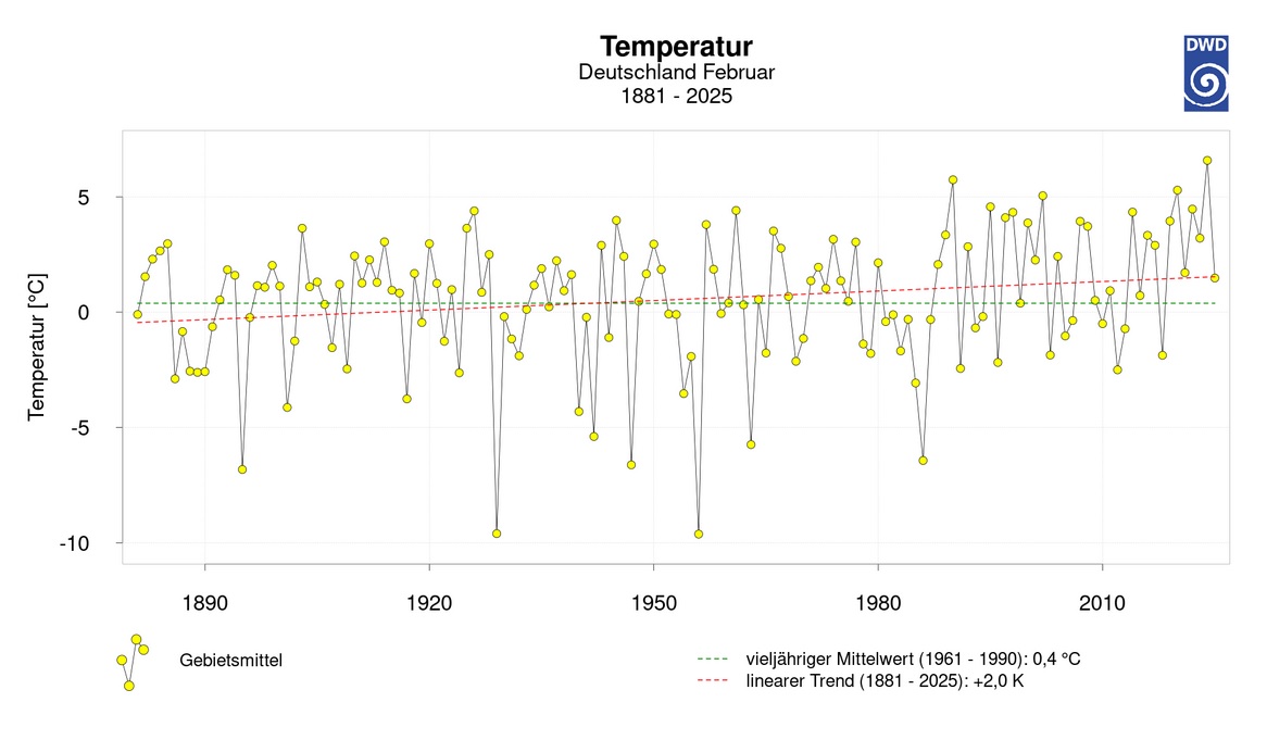 Wir fragen uns: Wo ordnet sich dieser Februar 2025 mit seinem 1,4 °C-Schnitt in die bis 1881 zurückreichende Klimareihe Deutschlands ein, und wie entwickelten sich die Februar-Temperaturen in diesem Betrachtungszeitraum bis heute?